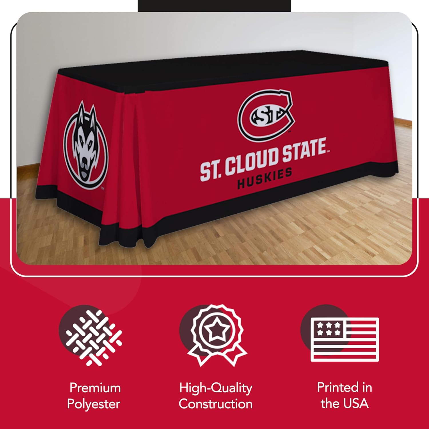 St. Cloud State Huskies College Sports Printed Table Throw - NCAA Licensed - Polyester - School Tablecloth (Red, White, Black) (6' Draped)